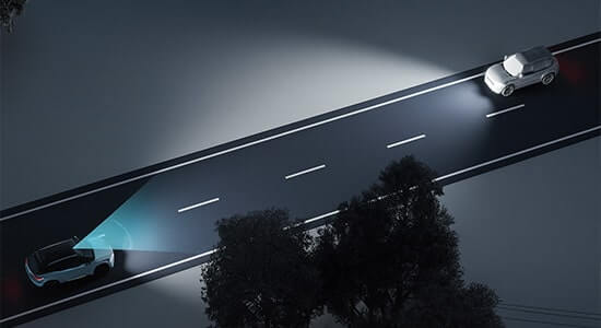 The lighting system automatically adapts between high and low beams based on surrounding traffic and road conditions, ensuring clear visibility without causing glare.