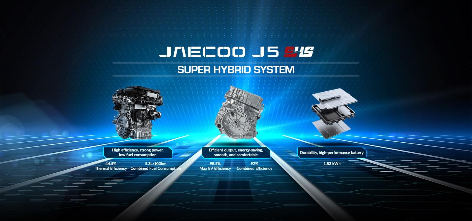 The Jaecoo J5 SHS HEV is powered by a fifth-generation 1.5TGDI DHE (Dedicated Hybrid Engine) paired with an intelligent electric motor. This advanced hybrid system automatically optimizes power delivery for smooth acceleration, quiet city driving, and confident highway performance.