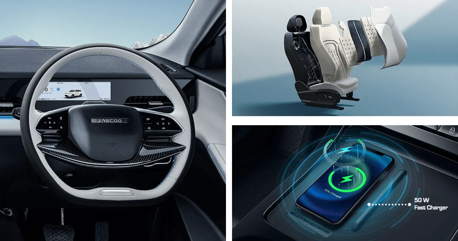 The cabin features durable PVC faux leather upholstery with a six-way power-adjustable driver’s seat and four-way adjustable front passenger seat. Ventilated front seats ensure comfort in warmer climates, while the rear 60/40 fold-down seats with headrests offer versatility. Multi-color ambient lighting and silent glass enhance comfort and cabin atmosphere, while dual-zone air conditioning ensures consistent climate control throughout.